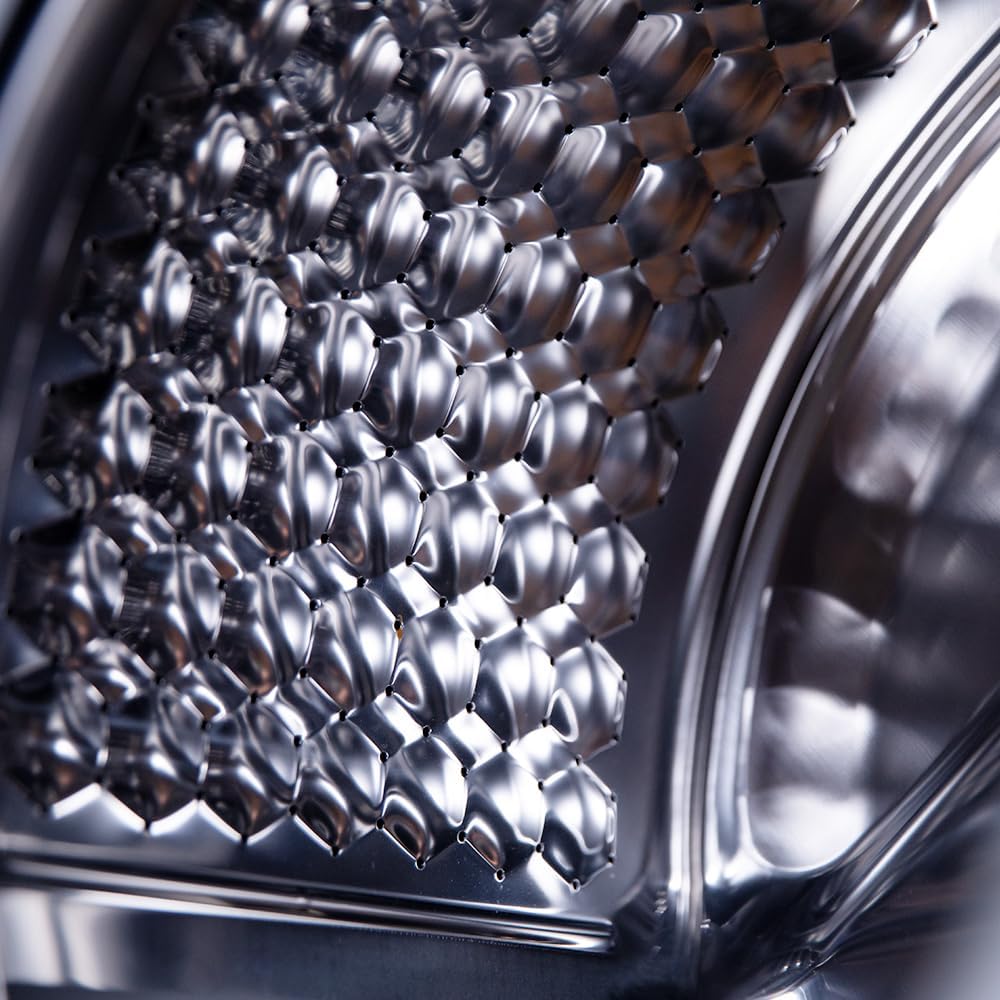 Le Pearl Drum, dont la surface texturée évoque des flocons de neige, favorise un meilleur glissement du linge, limitant l’usure des textiles tout en améliorant la circulation de l’eau et de la lessive.